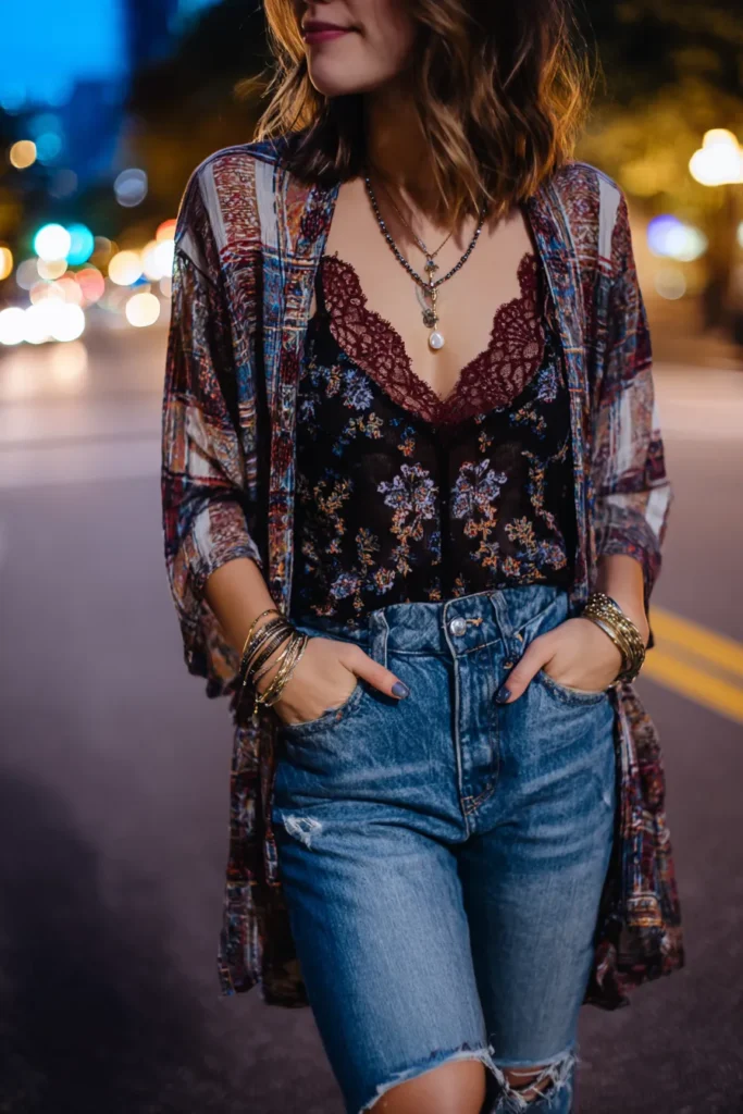 This look is a fabulous example of layering delicate pieces for a textured, bohemian date night in the city. She pairs distressed, high-waisted denim shorts or boyfriend jeans with a gorgeous, detailed camisole featuring a deep V-neckline trimmed with rich burgundy lace. Over this, she layers a flowing, long kimono or duster jacket in a complex, muted tapestry or paisley print that incorporates deep reds, blues, and creams. Her neck is adorned with delicate, layered necklaces, including one with a pearl drop, and her wrists boast stacks of thin metallic bangles.