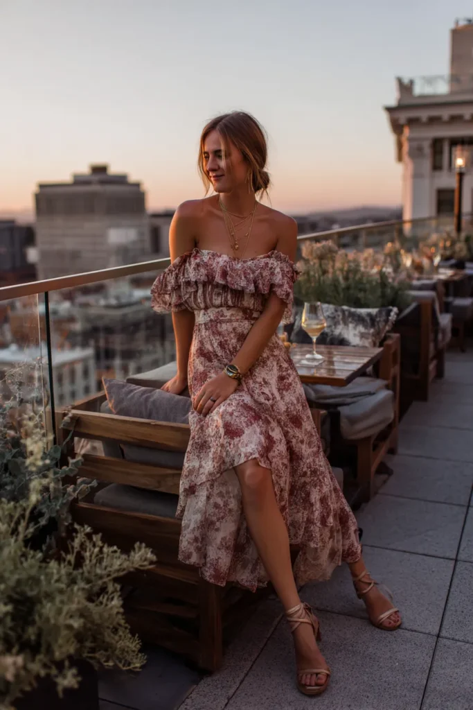 I find this dress so incredibly romantic for a date night, especially enjoying drinks with a view like this. The off-the-shoulder style is inherently flattering because it highlights your collarbones and shoulders, which is always a good idea. Pairing a slightly dressier, printed midi dress with simple lace-up heels keeps the look balanced—it feels polished but still totally relaxed and not overdone. Seriously, when the lighting hits just right, an outfit like this makes me feel like the star of my own romantic movie.