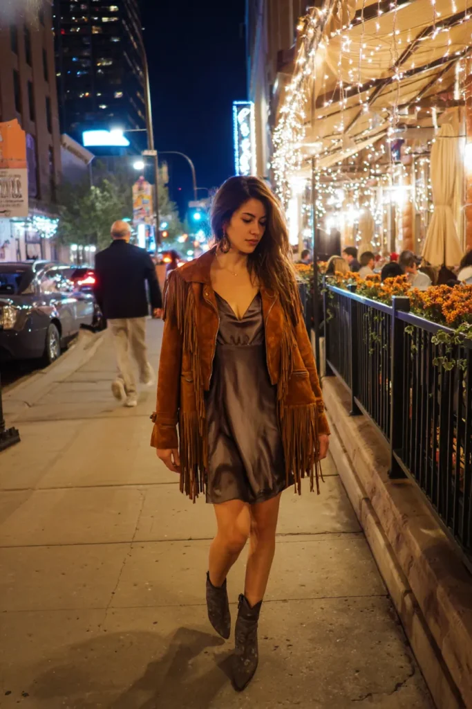 This look is serving up major effortless cool for a downtown evening date where you might be walking between spots or enjoying outdoor patio seating. She pairs a sleek, short slip dress in a sophisticated dusty gray or muted bronze satin that catches the city lights beautifully. Over this delicate piece, she throws on a statement-making, cognac or rust-colored suede jacket completely covered in long, dramatic fringe. The outfit is finished with chic, dark-toned pointed cowboy or Western-style ankle boots.