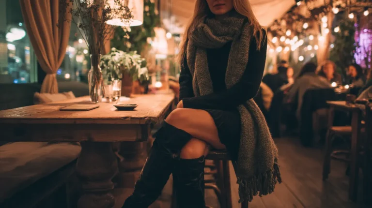 I think this outfit is fantastic because it nails the balance between being warm enough for the evening chill and totally ready for a romantic vibe. The little black dress underneath is a perfect, classic base, and draping that large, fringed plaid wrap over the shoulders gives it that free-spirited, layered boho feel without needing a heavy coat. The fringe adds so much lovely texture and movement as you walk. By keeping the boots black and simple, it keeps the attention on the amazing shawl. If you’re looking for something cozy but still slightly mysterious and romantic for a date, this mix of soft texture and dark structure is just perfect.