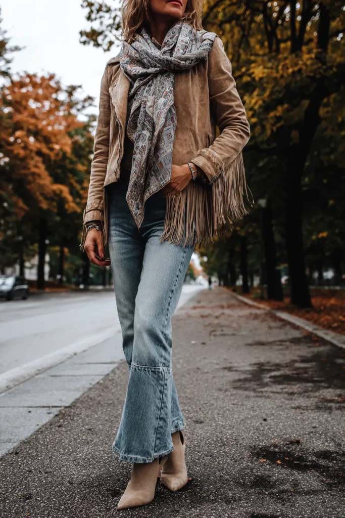 This outfit is the definition of effortless boho confidence. She’s wearing a soft tan suede jacket with playful fringe detailing along the sleeves, layered over a neutral top and paired with light-wash flared jeans. A patterned scarf wraps loosely around her neck, adding a touch of print and warmth, while taupe ankle boots complete the look. The earthy tones and retro silhouette give it that relaxed 70s-inspired vibe that never goes out of style.