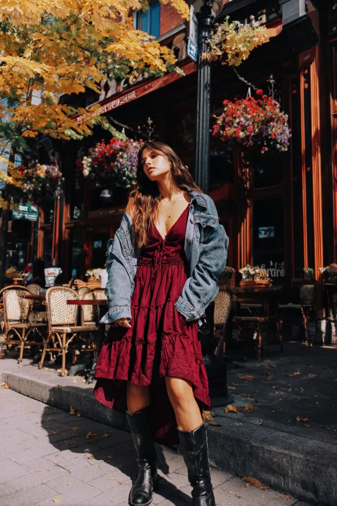 This outfit captures that perfect in-between vibe of fall—romantic yet relaxed. She’s wearing a flowy burgundy dress with soft tiers that move beautifully, layered under an oversized denim jacket that gives the look a cool, effortless touch. The black knee-high boots ground the outfit, while the gold pendant necklace adds a little shimmer. The mix of airy fabric with heavier denim creates a nice balance for crisp autumn days.