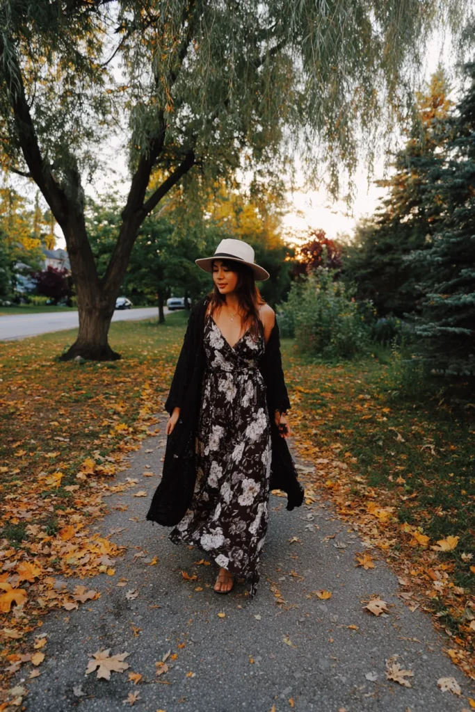This outfit is the definition of fall boho comfort. She’s wearing a flowy floral maxi dress in deep earthy tones, layered with a loose black knit cardigan that drapes effortlessly. The wide-brim hat in soft beige adds that touch of wanderlust charm, and the flat sandals keep the look grounded and relaxed. The fabrics move naturally with each step, catching the light just right among the fallen leaves.