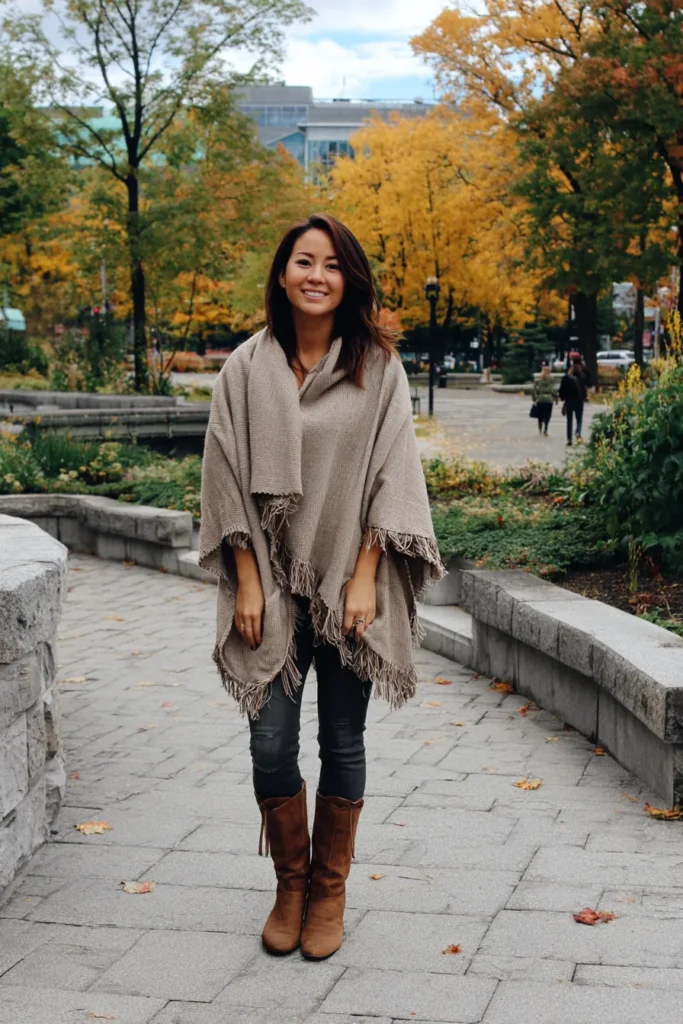 I love how this outfit feels like wearing a blanket but still looks put together. The poncho adds movement and charm without trying too hard, and those boots pull everything together in the most down-to-earth way. It’s exactly what I’d throw on for a stroll through the park or a spontaneous coffee run on a crisp autumn morning.