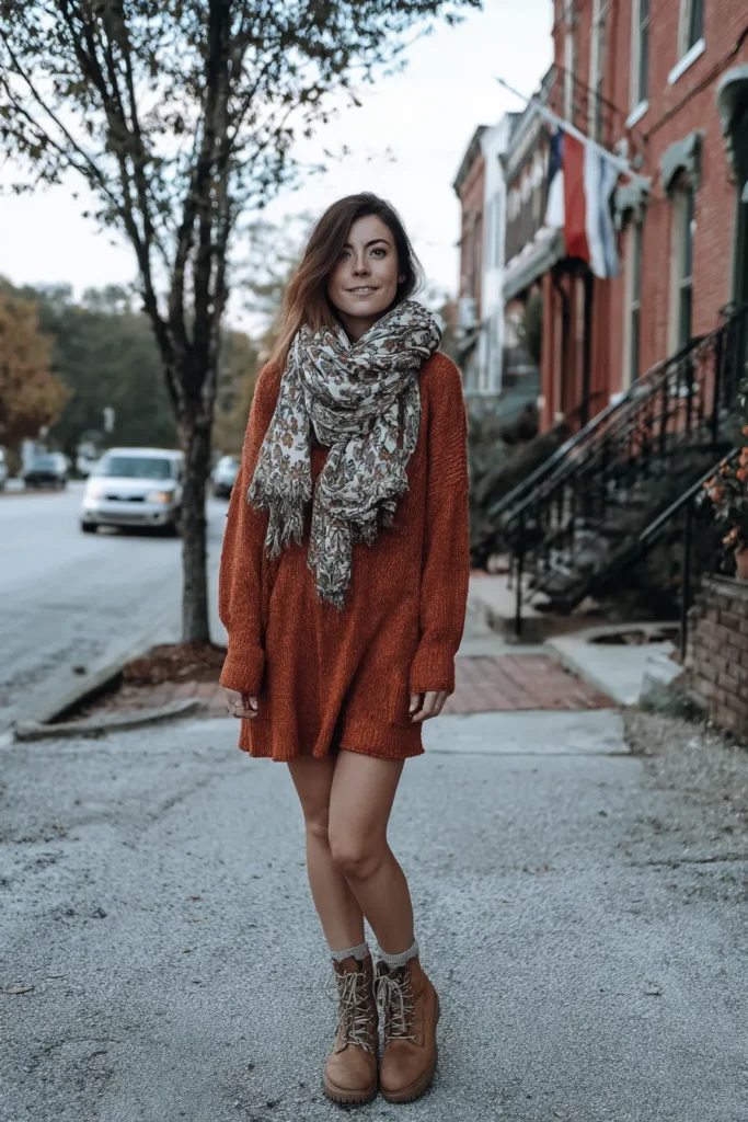 This outfit feels like autumn wrapped in a cozy hug. She’s wearing a chunky rust-colored sweater dress with a soft, oversized fit that gives effortless boho charm. The floral scarf draped loosely around her neck adds a lovely mix of print and texture, while the tan lace-up boots and thick socks keep it casual and cute. The warm tones and soft fabrics make it perfect for those crisp fall mornings.