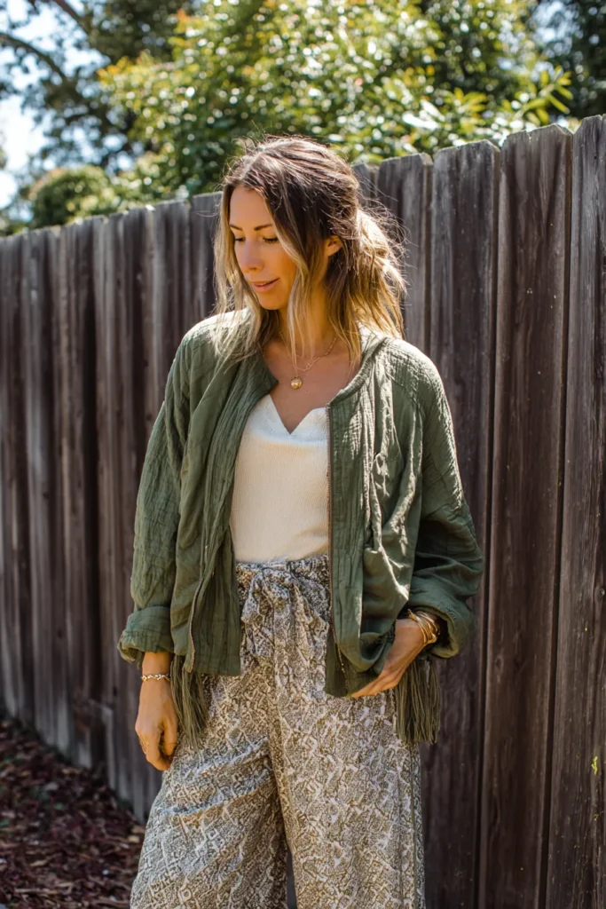 This outfit brings together everything I love about laid-back fall style. She’s wearing a soft olive green jacket with a crinkled, relaxed texture layered over a cream tank top. The high-waisted printed wide-leg pants add that perfect boho flair with their flowy fit and tie-waist detail. The muted color palette feels earthy and natural, giving the whole look a calm, effortless vibe.