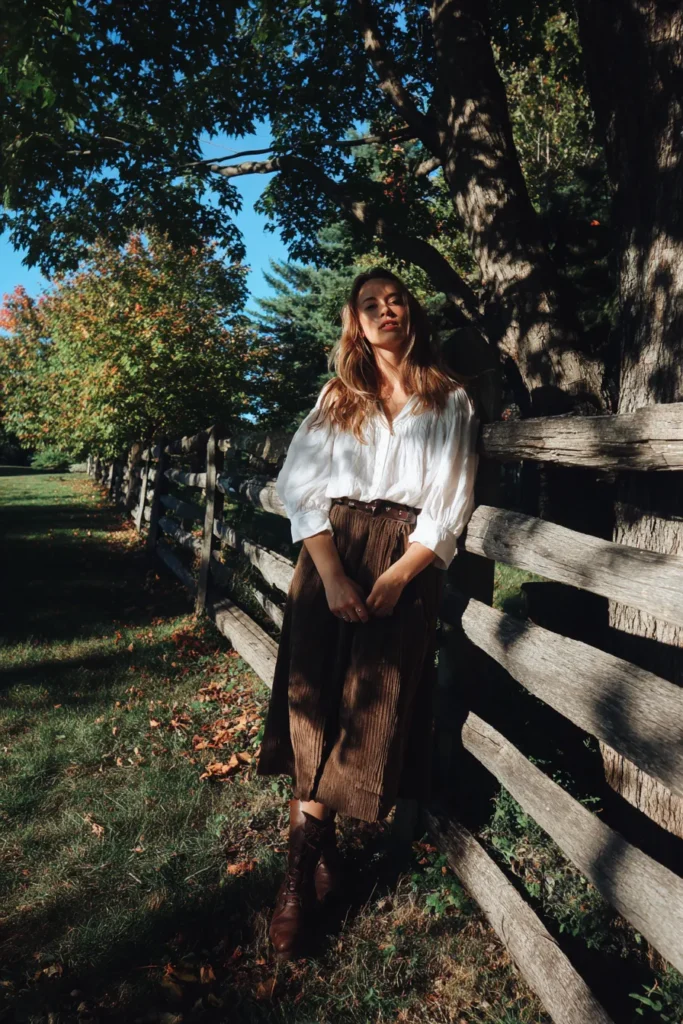 This outfit feels like a timeless fall classic with that effortless boho charm. She’s wearing a loose white blouse with soft, billowy sleeves tucked into a high-waisted brown corduroy skirt that hits mid-calf. The look is finished with lace-up brown boots that add a rustic touch. The fabrics are rich and textured, catching the golden sunlight in the prettiest way.