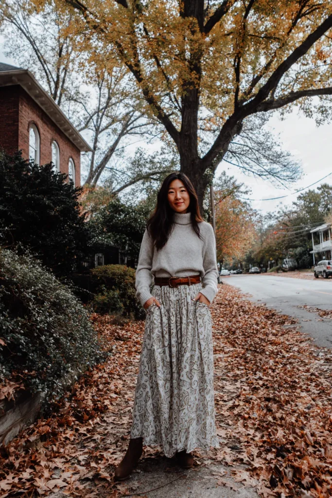This outfit is such a cozy fall dream. She’s wearing a soft gray knit turtleneck tucked into a flowing printed maxi skirt in muted earthy tones. The brown leather belt cinches the waist beautifully, giving just the right amount of shape, and the ankle boots complete the look with a subtle rustic touch. The whole outfit feels balanced and natural, like it was made for strolling through crunchy leaves on a chilly afternoon.