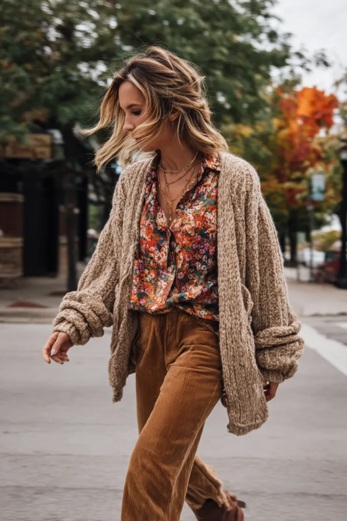 This outfit captures that perfect boho balance of cozy and colorful. She’s wearing a chunky beige knit cardigan layered over a bright floral blouse filled with autumn hues of orange, pink, and red. The blouse is tucked into soft brown corduroy pants that add a lovely vintage feel, while the textures and patterns together create that relaxed, effortless charm boho style is known for.