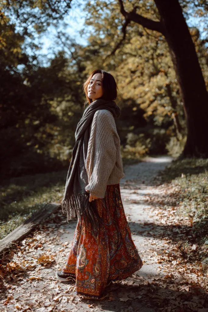 This outfit is the kind that makes you fall in love with autumn all over again. She’s wearing a flowy paisley maxi skirt in warm reds and oranges paired with a chunky beige knit sweater that looks soft enough to nap in. A long charcoal scarf drapes loosely around her neck, adding both warmth and texture. The mix of prints, knits, and earthy tones gives it that perfect laid-back boho vibe.
