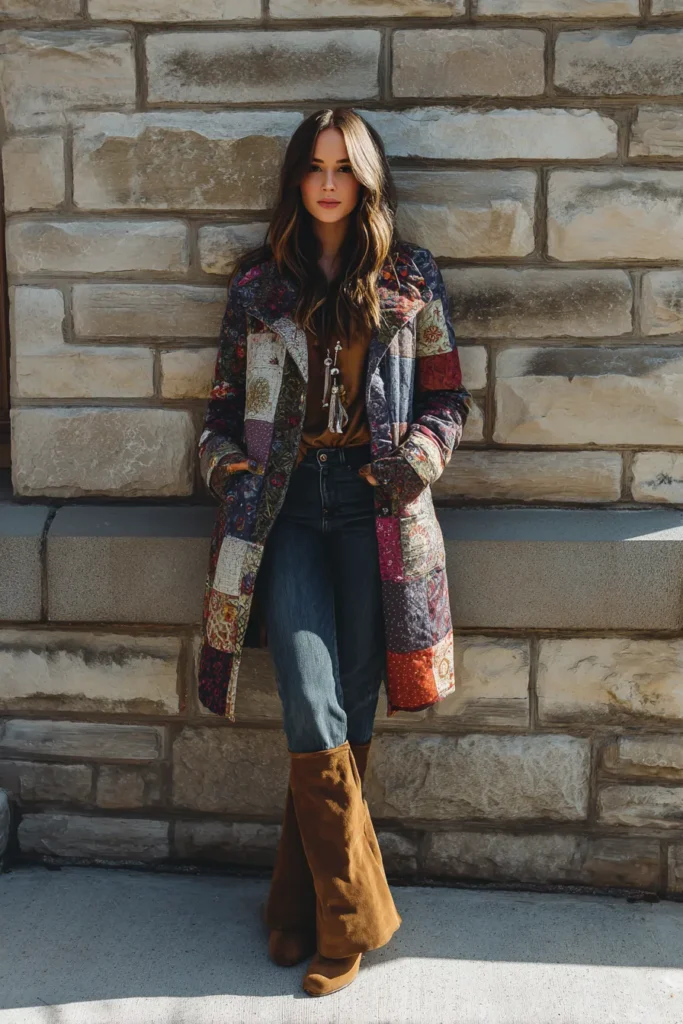 I adore how this outfit feels like a warm hug on a crisp fall day. The patchwork coat steals the spotlight, but the earthy tones keep it totally wearable. The mix of fabrics and colors makes it feel artistic without trying too hard. It’s one of those outfits that makes me want to grab a chai latte and stroll through a weekend market in total boho bliss.