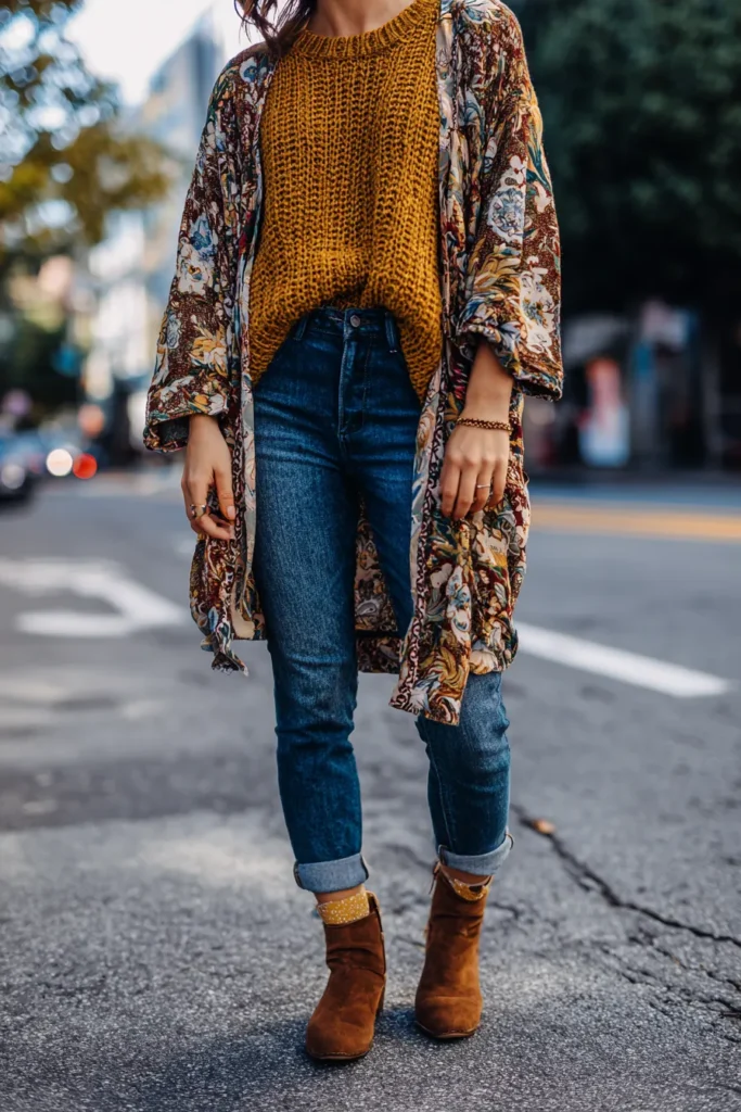 This outfit brings out all the cozy boho energy a fall day could need. She’s wearing a chunky mustard knit sweater tucked loosely into classic blue jeans, topped with a flowy floral kimono that adds that effortless layered charm. The warm tones in the cardigan mix beautifully with the golden socks peeking out above suede ankle boots, tying the whole look together in the prettiest autumn palette.