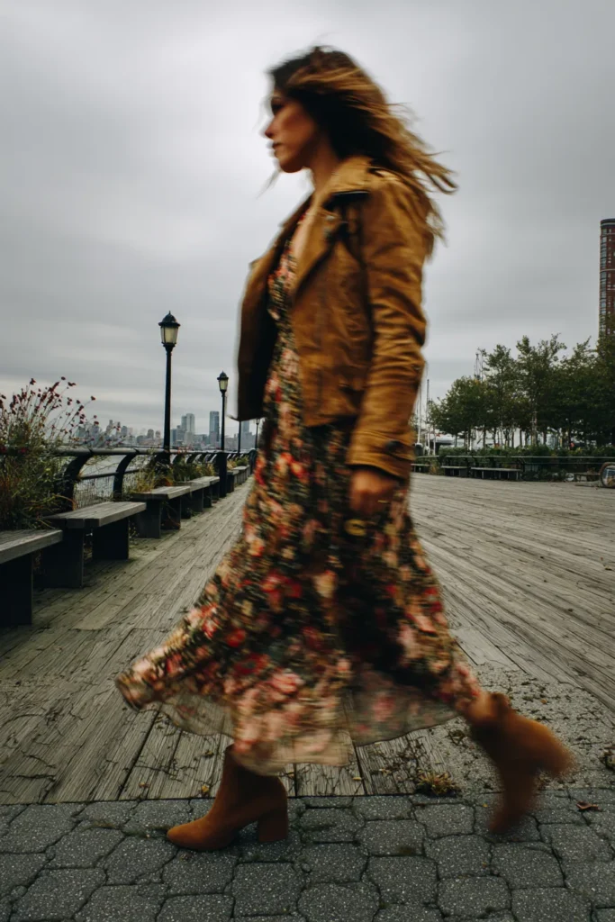 I love how this outfit balances contrast so well. The feminine floral dress softens the toughness of the leather, and the boots give it that confident, carefree vibe. It’s one of those looks that feels effortless but turns heads everywhere you go. Perfect for those golden fall evenings when the air feels crisp and the light is just right.