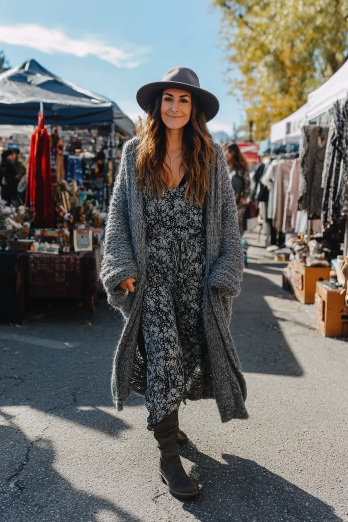 This outfit feels like the ultimate cozy boho market look. She’s wearing a black-and-white floral maxi dress that moves beautifully with every step, layered under a long chunky gray knit cardigan that’s basically wearable comfort. The slouchy boots and wide-brim hat pull the whole outfit together, giving it that effortlessly free-spirited vibe that makes boho style so lovable.
