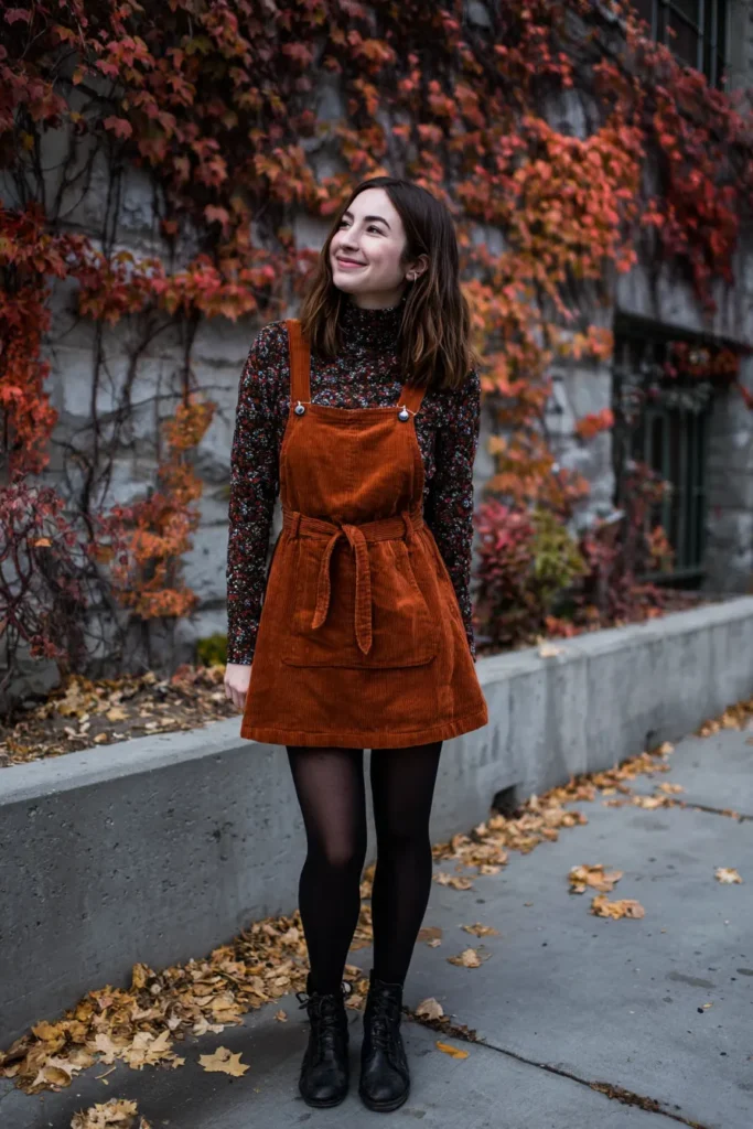 This outfit feels like autumn in the most charming way possible. She’s wearing a burnt orange corduroy overall dress with a belted waist that flatters her figure perfectly. Underneath, a dark floral turtleneck adds a soft, vintage touch, while black tights and lace-up boots keep the look grounded and cozy. The textures and colors blend together beautifully, matching the fall leaves in the background.