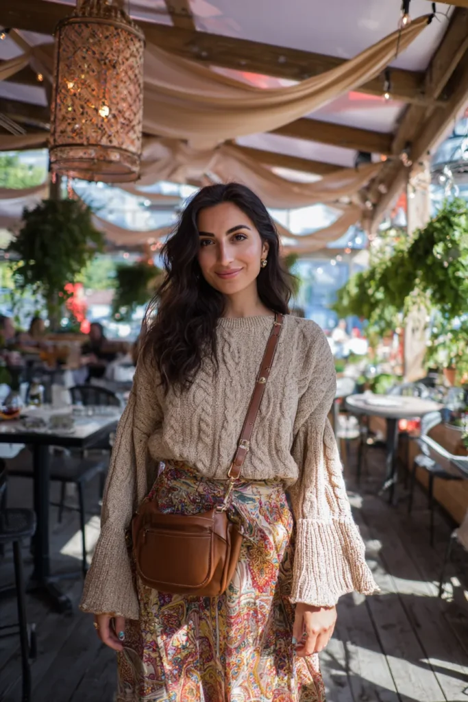 This outfit is the perfect mix of cozy and chic. She’s wearing a soft beige cable knit sweater with slightly flared sleeves, tucked into a colorful paisley midi skirt that adds a playful touch. The warm tones of the skirt pick up the earthy feel of the sweater, while a brown leather crossbody bag ties everything together. The textures and colors make this look feel effortlessly bohemian and ideal for a relaxed fall day.