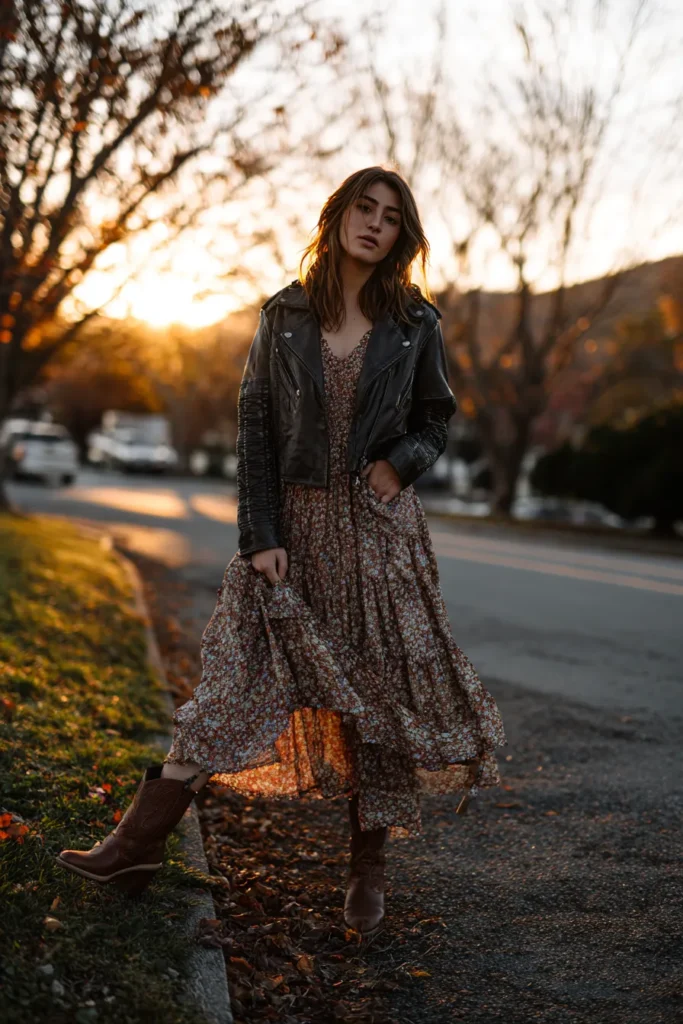 This outfit is the perfect mix of soft and edgy. She’s wearing a flowy floral maxi dress with tiny prints in warm earthy tones, paired with a sleek black leather jacket that instantly adds attitude. The brown cowboy boots tie it all together, keeping it true to the boho spirit while giving it a slightly rebellious twist. The way the sunset light hits the layers of the dress makes the whole look feel dreamy and cinematic.