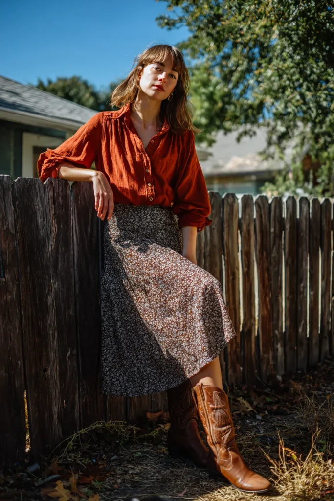 This outfit is a perfect nod to earthy fall tones. She’s wearing a deep rust blouse with a soft, flowy fabric that catches the light beautifully, paired with a brown floral midi skirt that adds a subtle touch of print. The cowboy boots make the outfit feel relaxed yet confident, giving it that timeless boho-country mix that never goes out of style. The combination feels both laid-back and put-together, like a crisp autumn afternoon captured in an outfit.