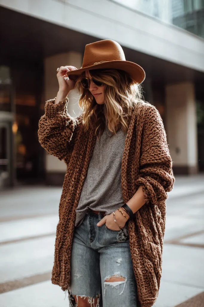 This outfit captures that laid-back boho vibe with a cool city edge. She’s wearing a chunky caramel-colored knit cardigan layered over a simple gray tee, paired with ripped light-wash jeans that give the whole look a bit of attitude. The tan wide-brim hat and aviator sunglasses add instant personality, while the mix of cozy textures and relaxed shapes keeps everything feeling easy and effortless.