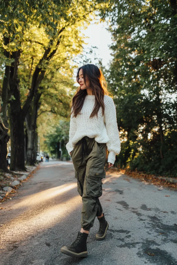 This outfit nails the perfect mix of cozy and cool. She’s wearing a chunky off-white knit sweater with soft, relaxed sleeves tucked effortlessly into olive green cargo pants. The pants have a slightly loose fit with pockets and drawstring detail, giving the look a casual, utilitarian twist. Black lace-up boots complete the outfit, adding structure and edge that balance the softness of the sweater beautifully.