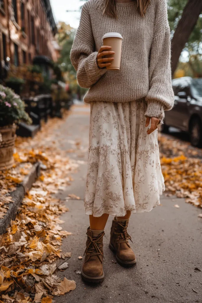 This outfit is the definition of cozy meets feminine. She’s wearing a thick, oversized beige sweater tucked just enough into a flowy cream midi skirt covered in a soft floral print. The outfit is finished with lace-up brown boots that give the whole look a rustic, autumn-in-the-city vibe. The mix of textures feels perfectly balanced—the knit keeps things warm and grounded while the airy skirt adds movement and charm.