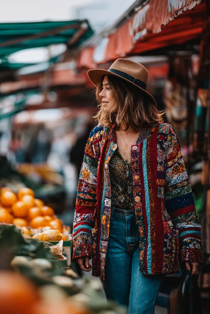This outfit feels like pure fall wanderlust. She’s wearing a vibrant patchwork jacket full of earthy reds, deep greens, and golden hues layered over a dark floral blouse. The medium-wash jeans keep things grounded, while the wide-brimmed straw hat adds that laid-back boho charm. Every detail of this look, from the textures to the color mix, feels warm, artsy, and full of personality—like something you’d wear while browsing a weekend market or strolling through a cozy old town.