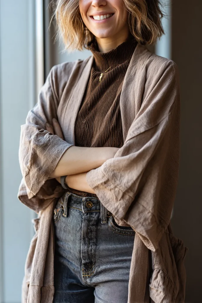 This outfit feels like calm confidence wrapped in soft layers. She’s wearing a ribbed brown turtleneck tucked into high-waisted faded jeans, topped with a loose, flowy beige kimono that drapes beautifully. The muted color palette gives off that effortless boho vibe, with earthy tones that feel both grounded and chic. It’s the kind of look that’s simple yet full of quiet detail—the kind that makes you look put together without even trying.