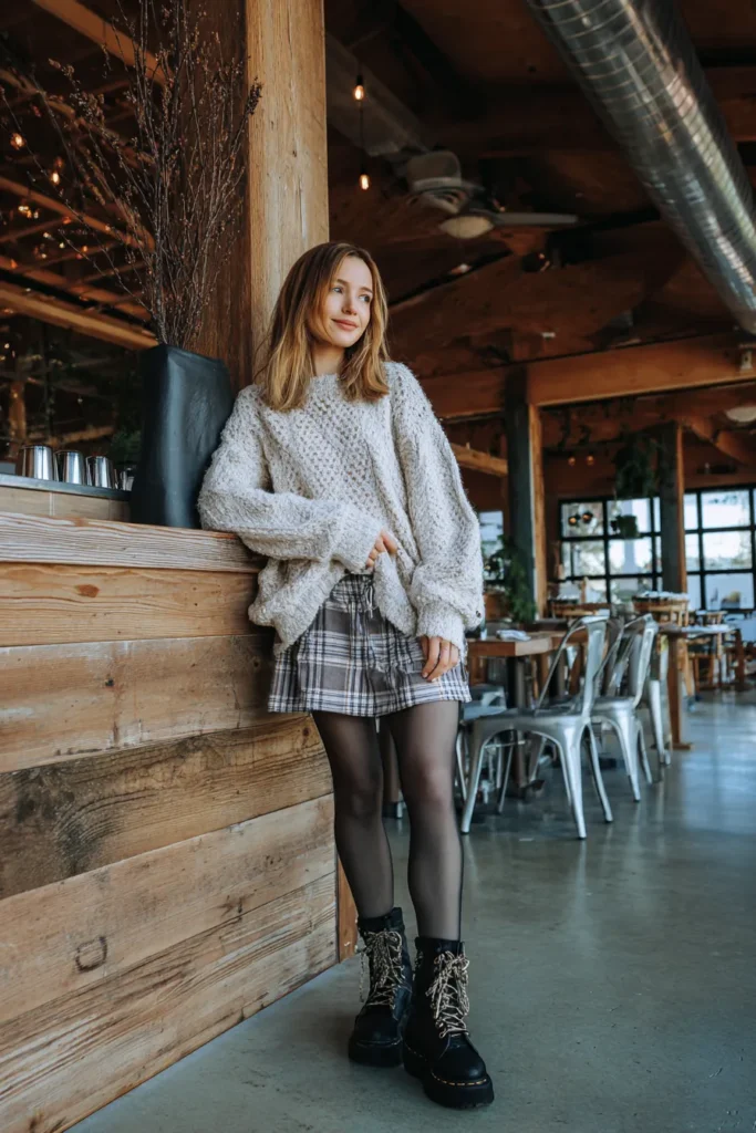This outfit is the perfect mix of cozy and cute. She’s wearing an oversized chunky knit sweater in a soft oatmeal shade paired with a brown plaid mini skirt that adds a touch of vintage charm. The sheer black tights and lace-up combat boots give the look an edgy balance, making it feel relaxed yet confident. The neutral tones and fuzzy textures make this outfit feel like a warm hug on a chilly afternoon.