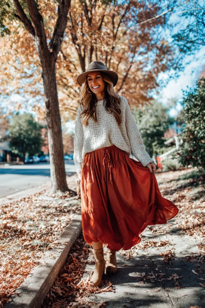 This outfit captures the heart of fall with its cozy textures and earthy tones. She’s wearing a chunky cream knit sweater that looks perfectly slouchy and soft, paired with a flowy rust-colored maxi skirt that moves beautifully with every step. A wide-brimmed felt hat and tan ankle boots complete the look, giving it that effortless boho charm that feels both playful and put-together. It’s the kind of outfit that makes you want to spend all day outside enjoying crisp autumn air.