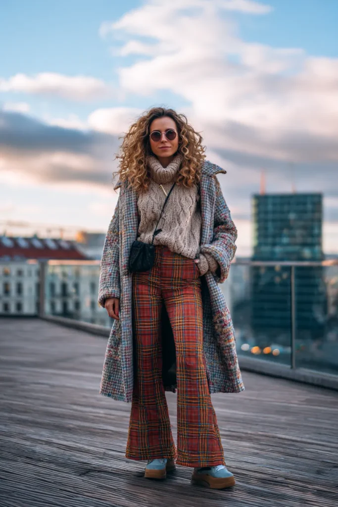 Seriously, the way these textures and patterns are mixed is just chef’s kiss amazing, right. I feel like this outfit just screams confident style without even trying hard. That plaid is so daring but the neutral knit sweater and the textured coat tone it down perfectly so it reads as intentional and chic instead of overwhelming. When I put together outfits like this, I love how the volume of the coat and the flare of the pants balance out perfectly, giving you that long, flattering line. Plus, the curly texture of her hair just fits the whole free-spirited, artistic vibe of the look so perfectly.