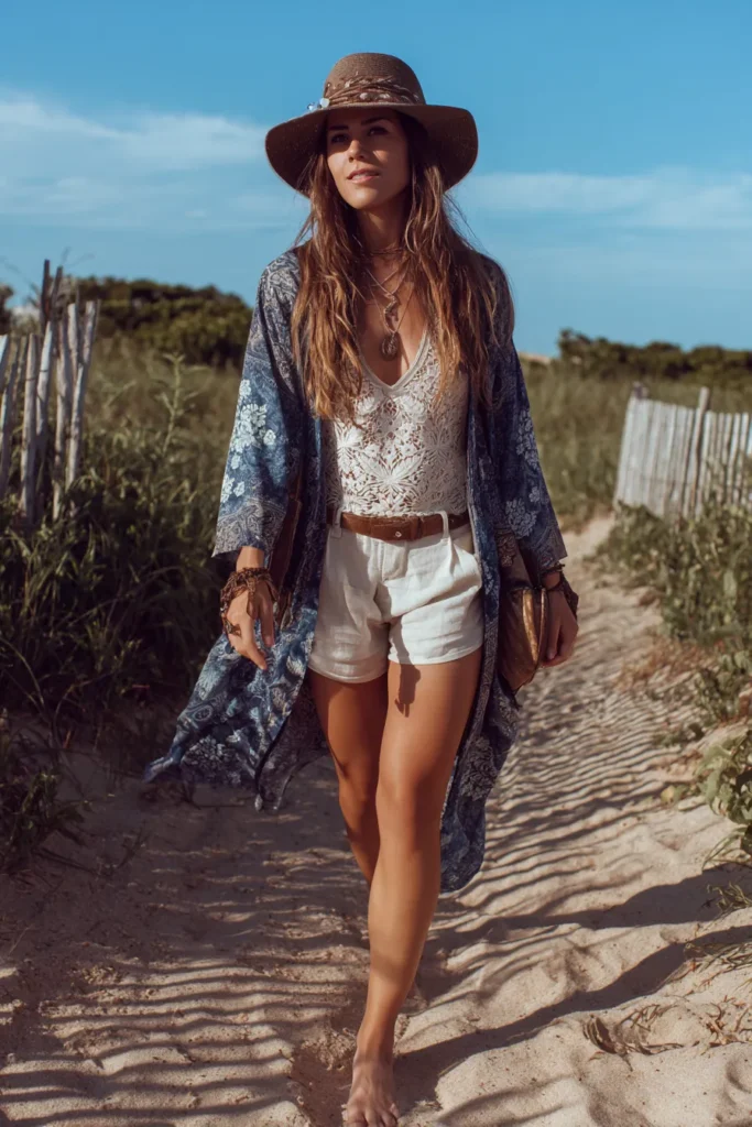 This is the quintessential effortless beach bohemian look ready for a sunny day by the dunes. She’s wearing crisp white linen or cotton shorts cinched with a thin brown leather belt, paired with a delicate white lace or crochet camisole that has a lovely textured deep V-neckline. The outfit is instantly elevated by a long, flowing duster or kimono in a beautiful blue and white print, possibly a delicate paisley or floral pattern, that billows beautifully as she walks. The look is crowned with a wide-brimmed straw hat decorated with subtle beads, and finished with layered, earthy necklaces and stacked bracelets.