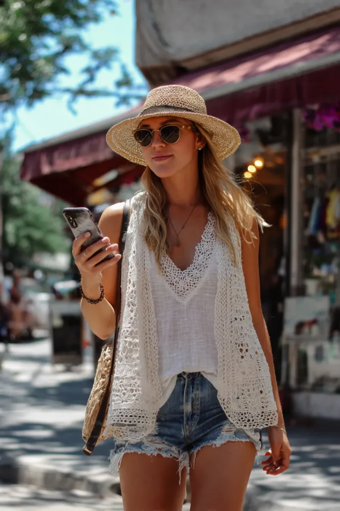 This is the ultimate bright summer boho look for exploring a charming little town or seaside shop district. The core outfit features distressed, high-waisted denim cutoff shorts paired with a light, flowing top made from textured white cotton or linen. Layered over the top is an amazing open-front vest or sleeveless cardigan made entirely of intricate, open-weave crochet work with scalloped edges, offering lovely texture and peekaboo moments. Her hair is worn long and loose with soft, sun-kissed waves, and she’s topped it all off with a straw fedora and round sunglasses for ultimate sun protection and style. Minimalist layered necklaces and a woven shoulder bag complete this perfect warm-weather aesthetic.