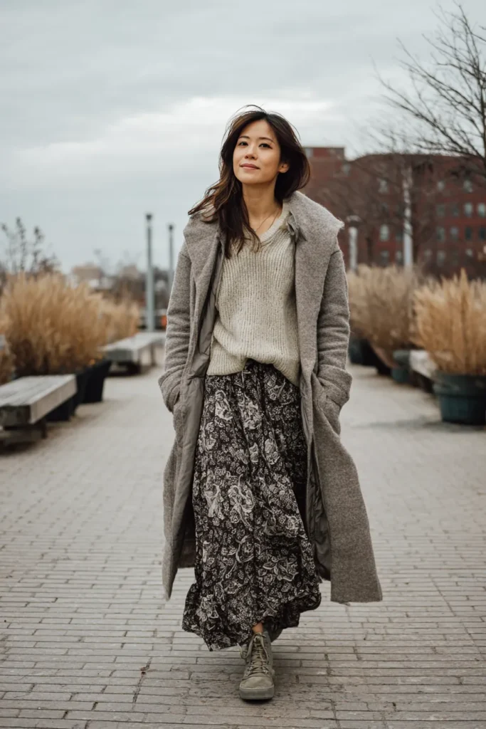 This outfit is built for comfort and warmth on a cooler, overcast day, embodying a subdued, sophisticated bohemian style. She is wearing a long, flowy maxi skirt with a dense, dark floral or paisley pattern, likely in shades of charcoal, cream, and muted earth tones. This is paired with a thick, light beige or cream cable-knit sweater featuring a slightly slouchy turtleneck, which is partially tucked in. The final outer layer is a long, generously sized, textured wool or bouclé coat in a soft, warm gray tone. The look is finished with sturdy, practical lace-up boots in a muted taupe or sage color, matching the earthy palette perfectly.