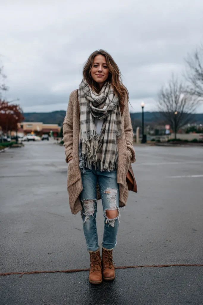 This outfit is the definition of cozy, effortless fall layering for when the weather is cool and a bit grey. She is rocking medium-wash, heavily distressed skinny or straight-leg jeans that are cuffed at the ankle to show off the boots. Underneath, there’s a light-colored top, possibly white or cream, layered under a chunky, oversized knit cardigan in a warm beige or oatmeal hue. The crucial layering piece is a very large, soft, plaid scarf in neutral tones of cream, gray, and black that is wrapped generously around her neck, adding incredible volume. The look is finished with sturdy, lace-up brown combat or work boots and a simple brown leather shoulder bag.