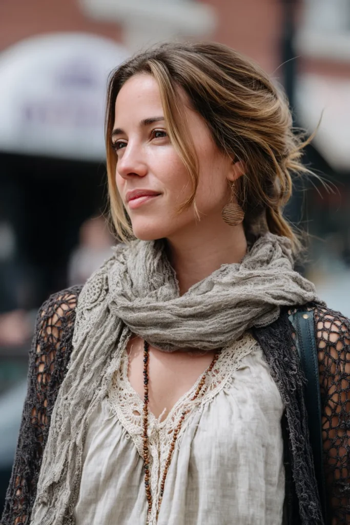 This look is a beautiful symphony of natural textures and soft, muted colors perfect for a slightly cool but bright day out. The base layer is a light beige or cream-colored peasant blouse, likely linen or a similar natural fabric, featuring delicate crocheted trim around the V-neckline. Over this, she wears an open, dark gray or charcoal crocheted shawl or cardigan that has an open, netted pattern, offering beautiful transparency. A light gray, crinkled, and voluminous scarf is wrapped loosely around her neck, adding incredible softness. Accessorizing is key with long, layered necklaces made of dark wooden beads and a single pendant with a striking blue stone, along with textured circular earrings.