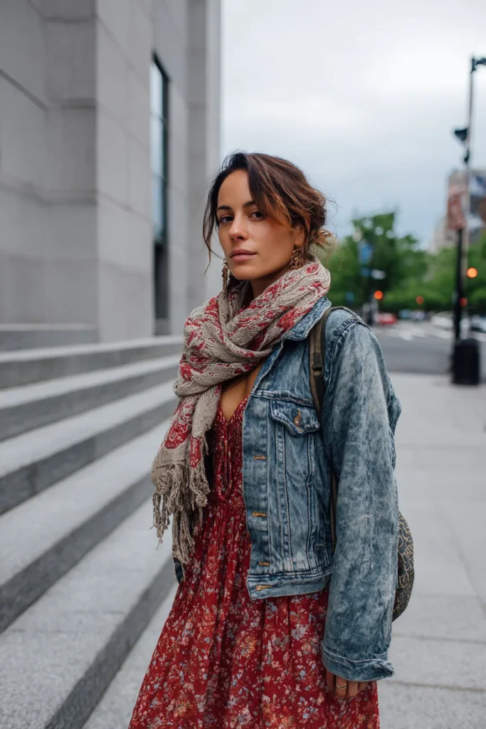 I think this combination works so well because it perfectly balances the structure of the denim with the lovely flow and pattern of the dress and scarf. Denim is such a great grounding element for rich boho prints, making the look feel immediately accessible and wearable for everyday life. I adore how the patterned scarf complements the dress without matching exactly it just adds another layer of visual softness near the face. It feels super flattering because the jacket defines the waist area while the pleated skirt flows beautifully as you walk, giving you that perfect mix of practical and pretty.