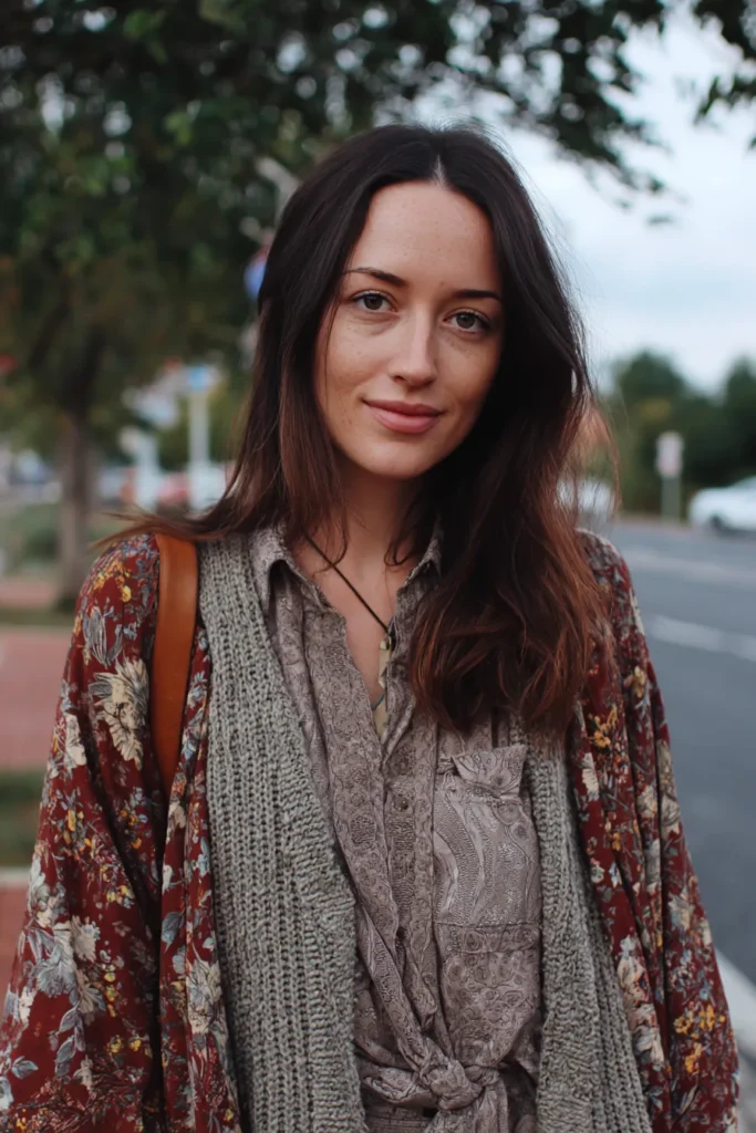 This layered moment is all about mastering the art of pattern clashing in the most harmonious way possible. We have a deep burgundy floral print kimono or loose cardigan setting the rich outer tone. Beneath that is a silky button-up shirt featuring a subtle, muted taupe or beige paisley print, tied casually at the front for definition. The middle layer is a cozy, chunky knit vest in a light grey or sage hue, adding crucial texture between the two prints. A simple dark pendant necklace rests perfectly against the collarbone, adding that final touch of effortless boho accessorizing.