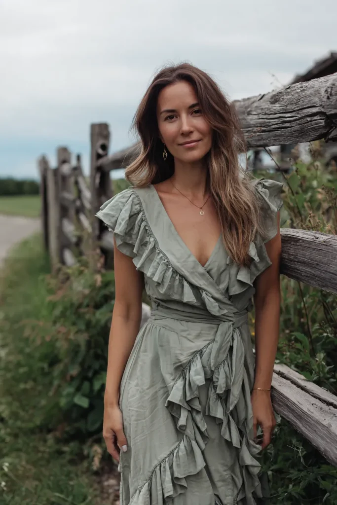 I am completely drawn to the soft, earthy color of this dress, it complements natural scenery so well, making it an ideal choice for photos. The wrap style is my favorite because it cinches you in perfectly at the waist while the flowing fabric ensures comfort and beautiful movement. I feel like the flutter sleeves are just the right amount of feminine detail without being too overwhelming. Keeping the jewelry simple with delicate gold pieces means the intricate ruffles of the dress remain the main event. This style is just so polished yet totally relaxed, perfect for feeling beautiful at any special gathering.