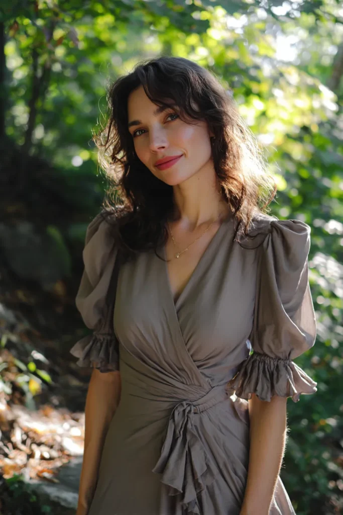This dress is an absolute vision for any occasion needing a touch of elevated, soft bohemian elegance, especially in a beautiful natural setting. The outfit centers on a dress in a gorgeous, sophisticated muted taupe or soft grey-brown color, made from a fabric that drapes wonderfully, perhaps a crinkled silk or fine cotton. It features a deeply flattering wrap V-neckline and dramatic, voluminous puff sleeves that gather into delicate ruffles at the cuff. The waist is defined with soft gathering and a self-tie detail, leading into a skirt that flows softly. Simple gold jewelry, like a single delicate necklace, keeps the attention on the beautiful structure of the garment.