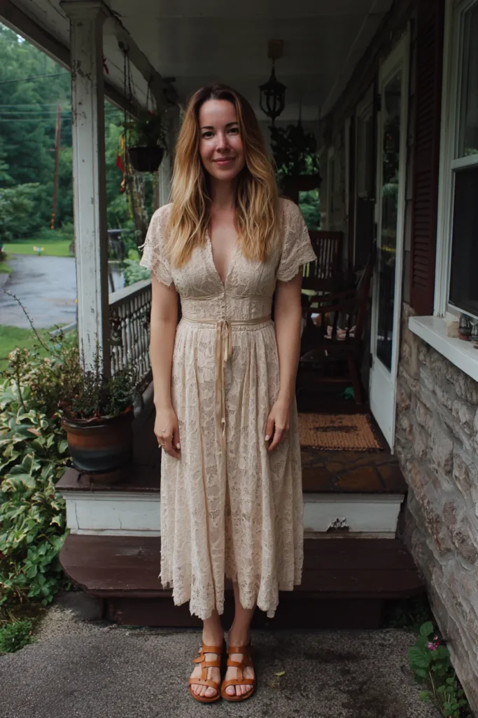I think this dress is just the most charming choice for celebrating new life. The lace detailing makes it feel immediately special and totally romantic, but the natural color keeps it feeling earthy and not too fussy. The way the bodice is structured and cinched at the waist is super flattering, giving shape while the looser skirt allows for easy movement, which is great for chasing kids or just enjoying the day. Pairing it with those simple leather sandals keeps the whole ensemble authentically boho and comfortable for being on your feet outdoors.