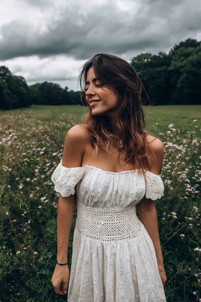 I absolutely adore how this dress blends delicate craftsmanship with a relaxed silhouette making it feel so authentic for a farm or countryside shoot. That crochet detail on the bust is so flattering because it draws the eye upward and gives structure to the otherwise breezy dress. When you wear something this white and flowy in a slightly moody, natural setting like this, the contrast is just stunning, making you pop without looking out of place. It’s the kind of dress that makes you feel like you could be starring in your own dreamy movie montage, honestly.