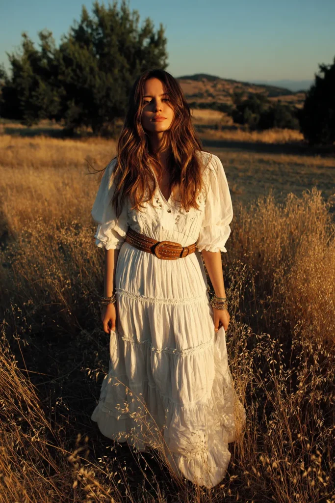 This look screams golden hour perfection set in a sun-drenched field of dry grasses. The star is definitely a beautiful white or cream-colored maxi dress made from what looks like crinkled or soft cotton, featuring romantic billowy sleeves gathered at the elbow. It has layers of gentle ruffles or tiers down the skirt adding tons of beautiful volume and texture. The most unexpected and chic touch is a wide, richly colored brown leather belt, perhaps embossed or studded, cinching the waist right over the flowy bodice for definition and that quintessential western-boho flair. She’s accessorized with layered gold necklaces and stacked bracelets too.