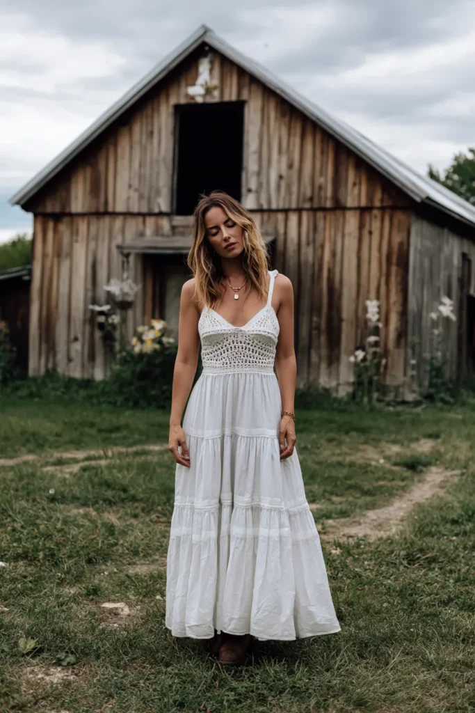 This is the ultimate romantic, rustic look featuring a gorgeous, flowing white maxi dress set against a weathered wooden barn. The dress has delicate spaghetti straps leading to a stunning textural element a hand-crocheted or open-knit bodice that beautifully shapes the upper body. Below the fitted top, the skirt falls in voluminous tiers of light, airy cotton fabric creating fantastic movement. The overall feel is very natural and free-spirited, beautifully contrasted with what appears to be dark brown ankle boots peeking out at the hemline.