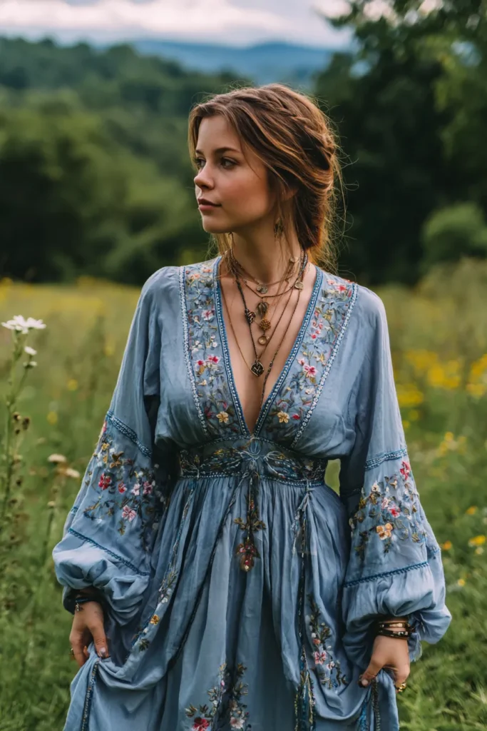 Check out this absolutely breathtaking maxi dress in a soft, dusty blue that perfectly complements the lush green landscape. This piece screams elevated folk style with its richly detailed embroidery featuring delicate floral patterns along the deep plunging V-neckline and the voluminous, billowy sleeves. The fabric looks light and soft, possibly chiffon or a fine cotton voile, creating beautiful drapes and movement throughout the skirt. The waist is cinched with a matching fabric tie, and it is styled with a stack of layered, earthy-toned necklaces for that perfect bohemian finish.