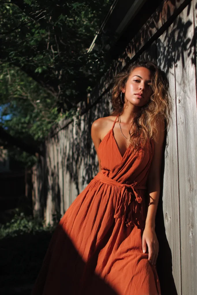 This look is pure sun-drenched bohemian glamour captured beautifully against a textured wooden fence. The dress is a stunning, vibrant rust or burnt orange color made from a light, flowy fabric that moves beautifully, likely cotton or gauze. It features a very flattering halter neckline that dips into a gorgeous wrap-style or deeply draped bodice, cinched at the waist with a self-tie belt made from the same material. The full, gathered skirt flows out giving a wonderful sense of drama, especially highlighted by the strong interplay of sunlight and shadow.