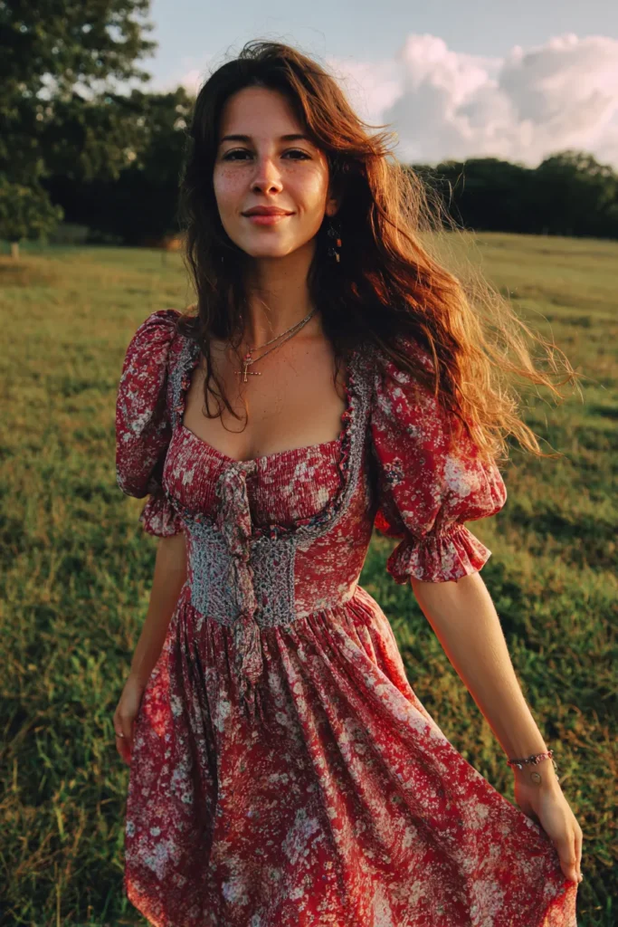 This vibrant dress is the perfect pop of color for a lush outdoor family shoot! It’s a romantic midi-length dress in a rich reddish hue covered in a delicate, almost painterly white or pale pink all-over floral print. The silhouette is super charming with a structured, smocked bodice that beautifully defines the bust and waist area. It features a sweetheart or soft square neckline and absolutely adorable short, slightly puffed sleeves with ruffled cuffs, giving it a true cottagecore meets boho feel.