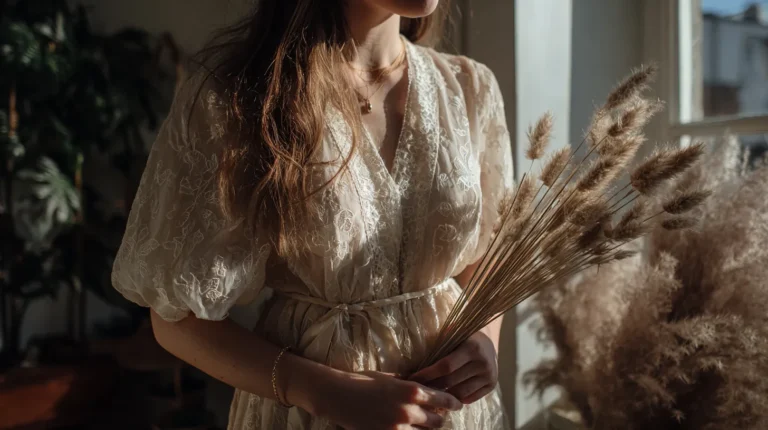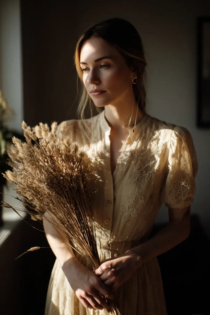 This look is all about capturing that golden hour magic with soft, romantic textures. The woman is wearing a gorgeous light beige or cream-colored dress featuring delicate embroidery or lace detailing, perhaps on the bodice and puff sleeves. The fabric looks light and airy, possibly cotton or linen, with a button-front detail reaching a soft mandarin collar. She holds a voluminous bouquet of dried grasses or feathery pampas grass which perfectly complements the earthy, muted tone of her ensemble. The whole vibe is incredibly ethereal and sweetly vintage, like a beautiful portrait from a bygone era.