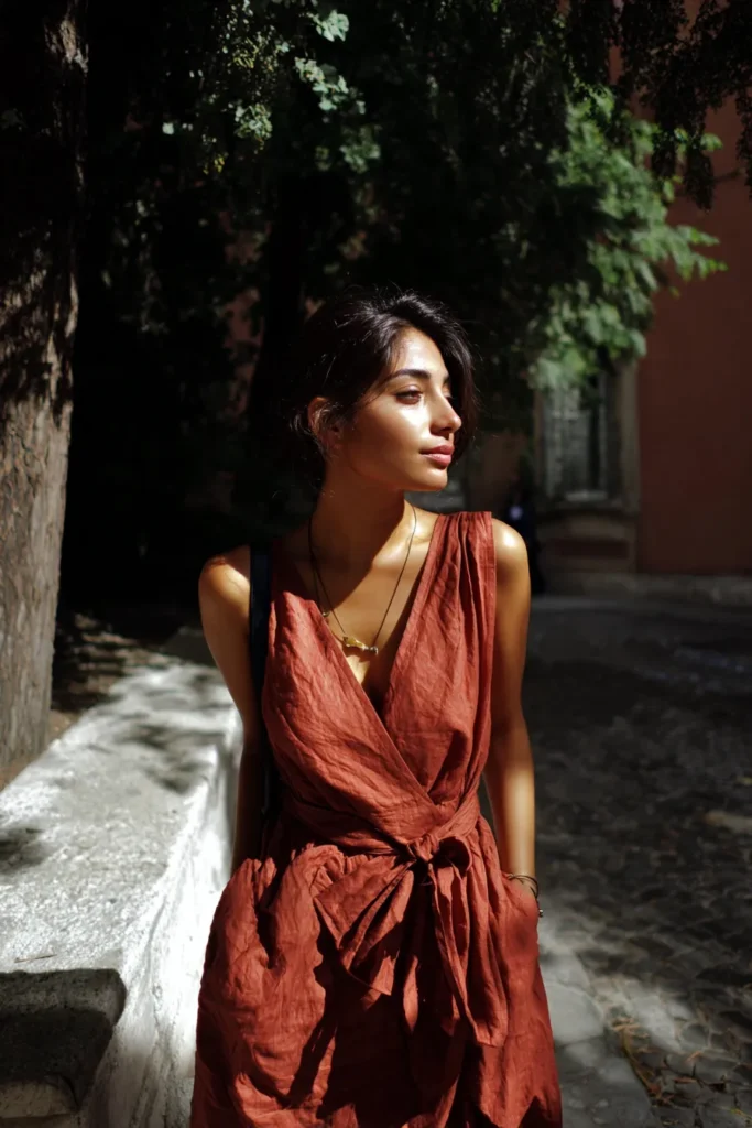 This ensemble is a sultry take on bohemian style, perfect for a warmer, slightly more urban setting like sunlit cobblestone streets. The dress is a beautiful, rich shade of deep rust or burnt sienna, made from a wonderfully textured, perhaps slightly wrinkled fabric that adds depth. It features a flattering sleeveless design with an elegant, deep V-neck created by the wrap-style front which ties right at the natural waist, creating beautiful gathers and volume in the skirt. A simple, earthy pendant necklace complements the neckline perfectly, adding just a touch of jewelry interest.