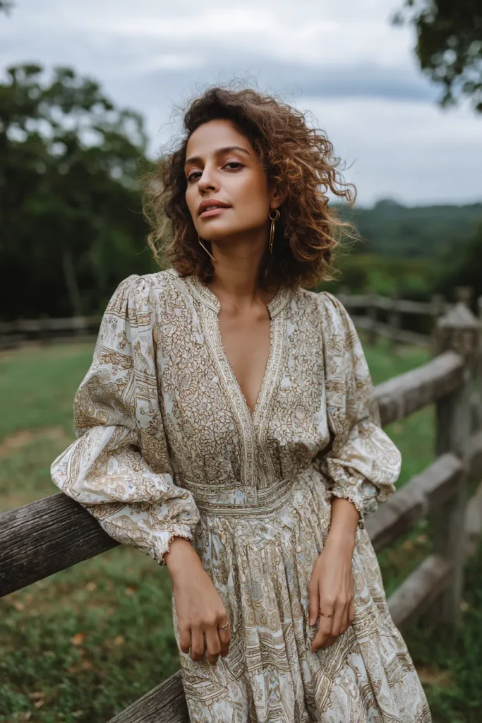 This dress is the perfect blend of intricate pattern and voluminous silhouette for a stunning outdoor portrait, especially with that moody sky backdrop. It’s a long-sleeved maxi dress featuring a detailed block print or patterned fabric in muted cream and earthy gold or taupe tones. The design boasts a relaxed fit through the bodice with a deep V-neckline and a subtle mandarin or band collar detail. The sleeves are a real statement here, long and beautifully puffed with gentle gathering at the wrists. The look is finished with minimal jewelry, letting the dress pattern and the beautiful natural setting do all the talking.