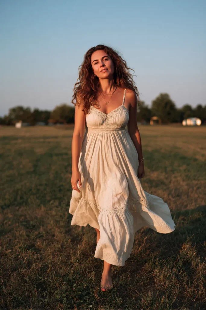 This is the quintessential carefree summer look featuring a stunning off-white or pale cream maxi dress. The dress has delicate spaghetti straps and a beautifully textured or crocheted bodice area, leading into a smocked or gathered waistline that flows out into a voluminous, tiered skirt. The fabric appears light and breathable, perfect for catching the breeze in an open field setting. She’s kept accessories minimal with layered gold necklaces and is walking barefoot in the tall grass which just amplifies that natural, untamed bohemian beauty.